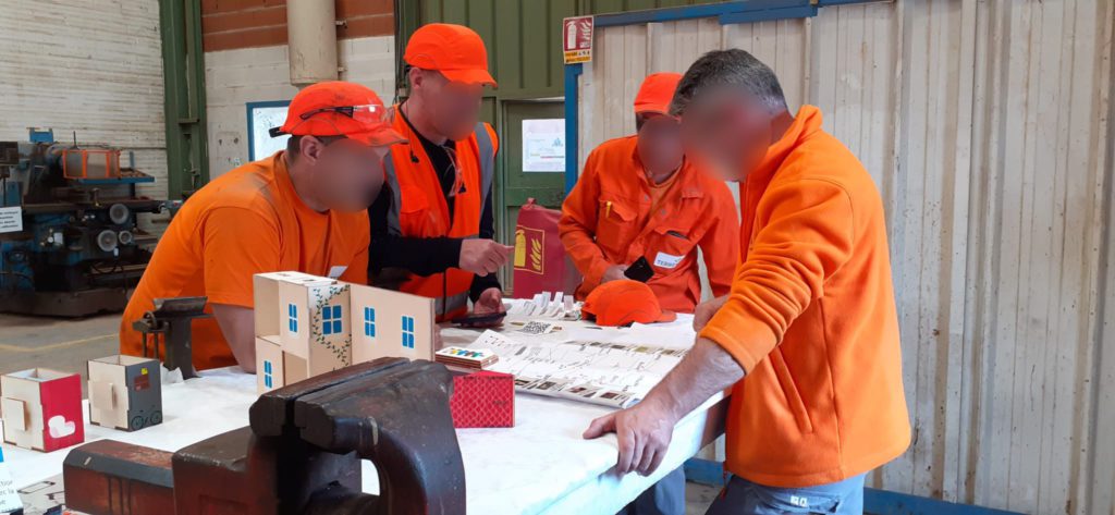 Nous leur avons proposé un escape game semi-personnalisé : nous reprenons la structure de l’escape game nomade La Maison, avec son matériel en bois peint, mais changeons certaines énigmes pour les adapter à leur activité.