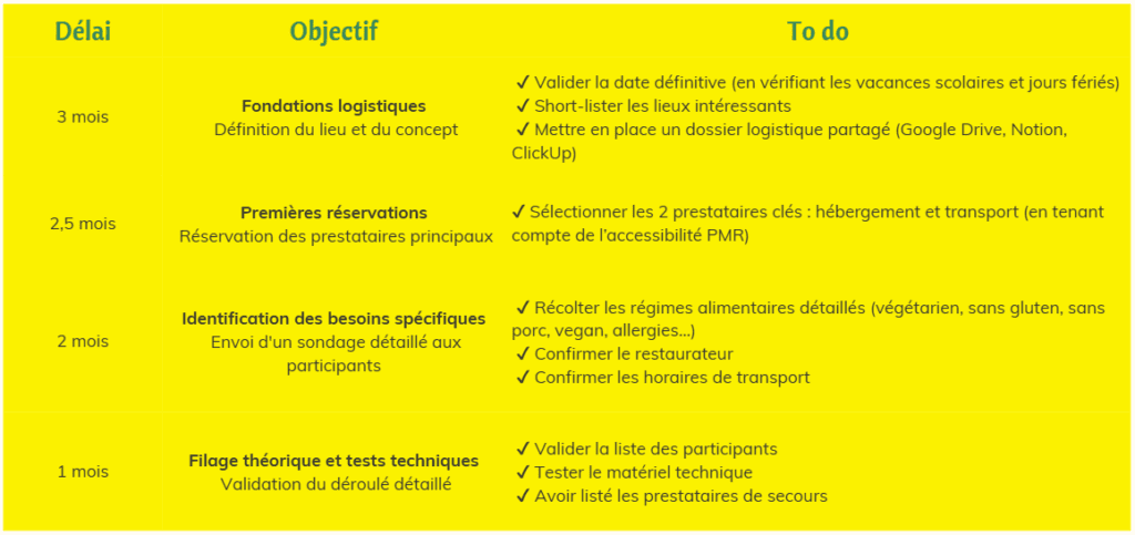 Pour éviter un problème logistique en team building, la clé réside dans une planification anticipée et rigoureuse. Voici une check-list complète, conçue pour être opérationnelle immédiatement.
